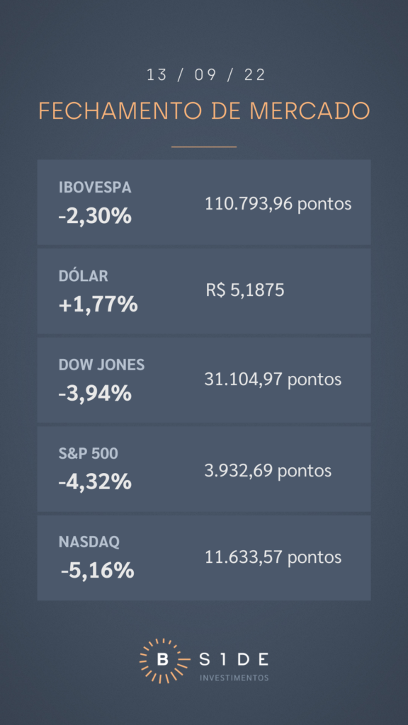 Em Wall Street, as bolsas americanas derreteram, com o índice Dow Jones registrando seu pior pregão desde junho de 2020 e os S&P 500, Nasdaq e Dow no pior dia de 2022. O movimento negativo aconteceu após índice de preços ao consumidor (CPI) subir 8,3% em agosto em relação ao mesmo mês do ano passado, acima do consenso de alta de 8,0%. Na variação mensal, o avanço foi de 0,1% em relação a julho, apesar da baixa nos preços da gasolina. O núcleo do CPI, que exclui os preços de energia e alimentos, avançou 6,3% em agosto em relação ao ano anterior, acima da taxa de 5,9% em julho. Este foi o último indicador de inflação divulgado antes da reunião de política monetária do Federal Reserve, que acontecerá nos dias 20 e 21 de setembro.