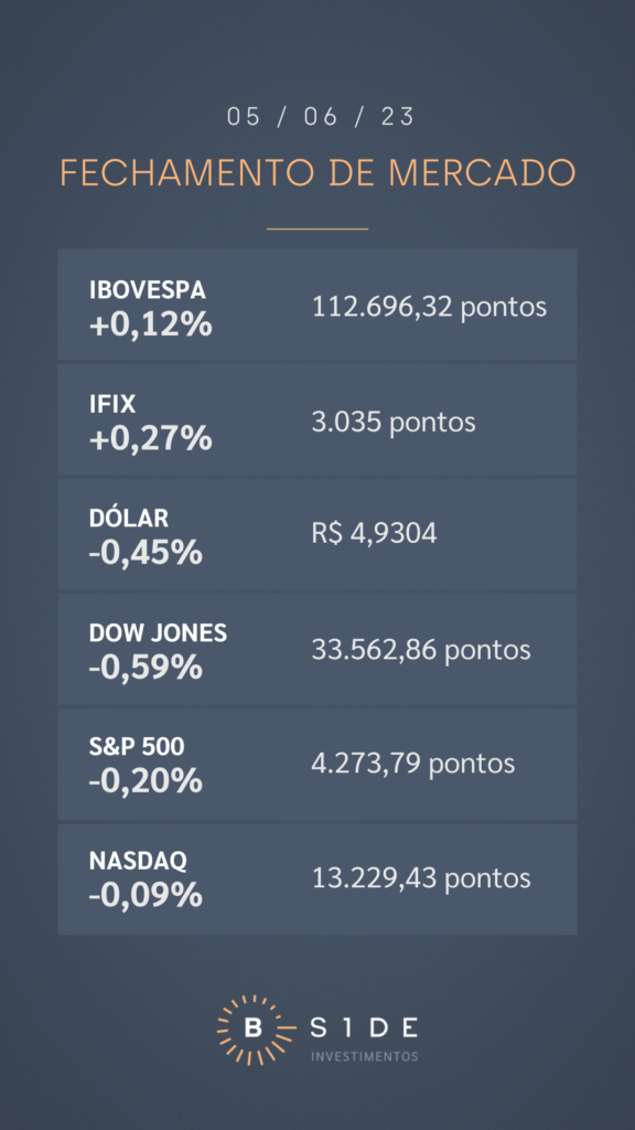 Em uma sessão negativa para os mercados acionários em âmbito internacional, após as últimas semanas serem marcadas por um movimento de recuperação, o Ibovespa registrou fraqueza, mas conseguiu encerrar o dia em leve alta de 0,12%, aos 112.696,32 pontos. A escassez de drivers relevantes e a semana encurtada por conta do feriado de Corpus Christi, que deixará a Bolsa fechada na próxima quinta-feira (8), contribuíram para a falta de apetite por risco no pregão. Hoje, o diretor de política monetária do Banco Central, Diogo Guillen, afirmou que a dinâmica da inflação “melhorou um pouco”, mas ainda há resiliência, adicionando que a inflação “está se movendo de bens para serviços”. Na próxima quarta-feira (7), será divulgado o IPCA de maio.