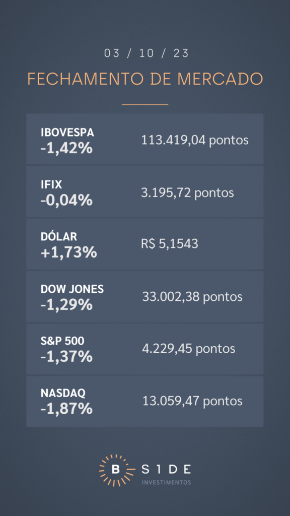 Em Wall Street, as bolsas americanas recuaram em bloco, novamente pressionadas pela alta dos Treasuries, os títulos públicos americanos, que operam em seus patamares mais altos desde 2007, elevando a preocupação de que taxas de juros elevadas nos EUA por tempo prolongado afetem o mercado imobiliário e levem a economia americana a uma recessão. O movimento de aceleração dos Treasuries ganhou força após a divulgação do relatório Jolts dos Estados Unidos, que registrou aumento de 9,6 milhões de vagas em agosto, acima da previsão de criação de 8,8 milhões de empregos, o que dá argumentos para o Fed ainda adotar uma postura dura.