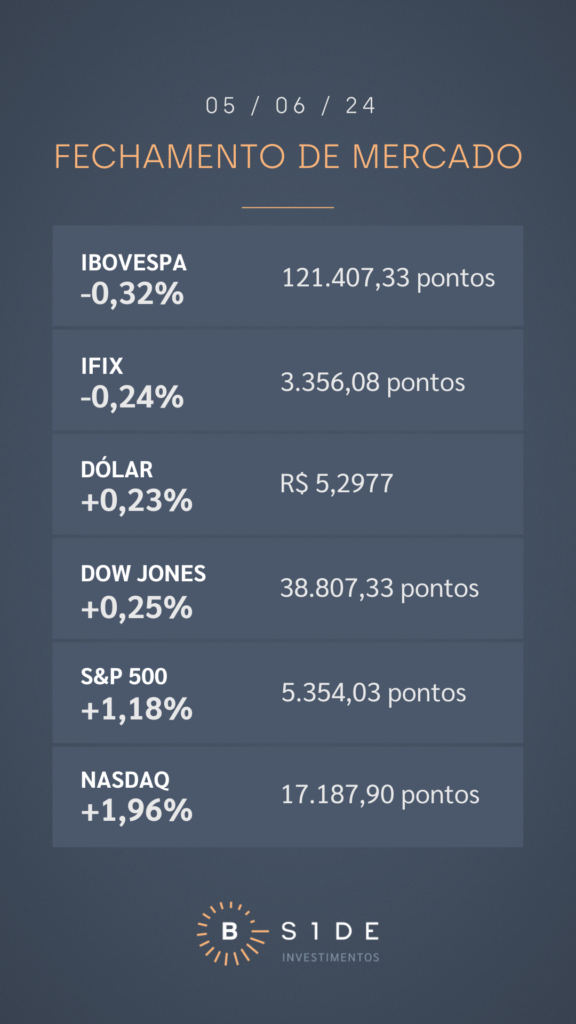 Em Wall Street, as bolsas americanas avançaram em bloco, com os índices S&P 500 e Nasdaq renovando recordes históricos de fechamento, apoiados pela valorização de 5,16% das ações de Nvidia, que bateu a marca de US$ 3 trilhões em valor de mercado. Além disso, uma nova bateria de dados mais fracos do mercado de trabalho americano também contribuíram para um sentimento de maior apetite a risco. O relatório ADP mostrou que as contratações do setor privado dos EUA desaceleraram para 152 mil empregos no mês passado, muito abaixo das expectativas de 175 mil novos postos de trabalho. O número contribuiu ainda mais para a leitura que o Fed possa iniciar o ciclo de corte de juros na reunião de setembro.