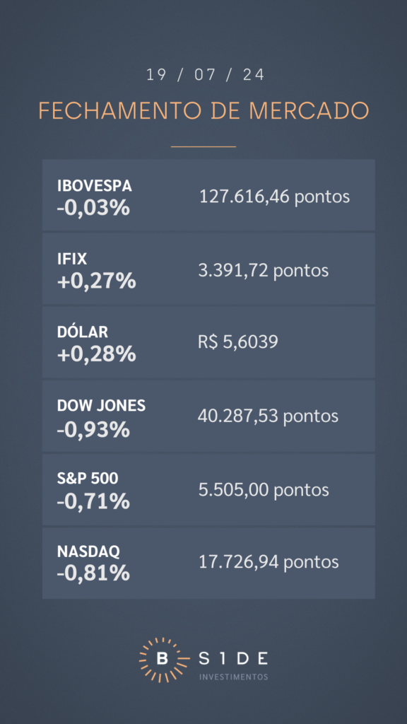 Em Wall Street, as bolsas americanas recuaram em bloco, em uma semana marcada por rotação de setores, com a venda das maiores companhias em favor de nomes menores. As small caps vêm sendo beneficiadas pela leitura do mercado de que o início do ciclo de corte de juros nos Estados Unidos será em setembro. No noticiário corporativo, as ações da CrowdStrike, especializada em segurança cibernética, tombaram 11,10%, após a companhia ser responsável por um apagão cibernético global, que provocou atraso em voos, além de prejudicar serviços bancários e de comunicação ao redor do mundo. Os papéis de Microsoft ON, uma das principais empresas afetadas pela CrowdStrike, recuaram 0,74%.