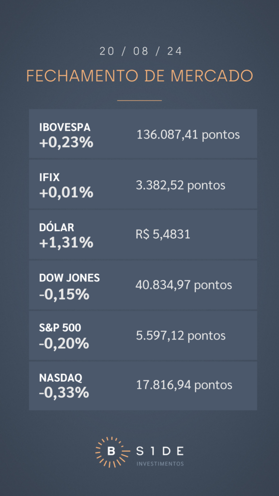 Em Wall Street, as bolsas americanas recuaram em bloco, em movimento de realização de lucros após oito pregões consecutivos de alta dos índices S&P 500 e Nasdaq. O mercado aguarda a divulgação da ata da última reunião do Federal Reserve, o banco central americano, amanhã, e o discurso do presidente do Fed, Jerome Powell, na sexta-feira, durante o Simpósio de Jackson Hole. Hoje, a diretora do Fed, Michelle Bowman, afirmou que a inflação permanece desconfortavelmente acima da meta de 2%, ainda que tenha visto progresso na diminuição das pressões na economia americana desde abril.