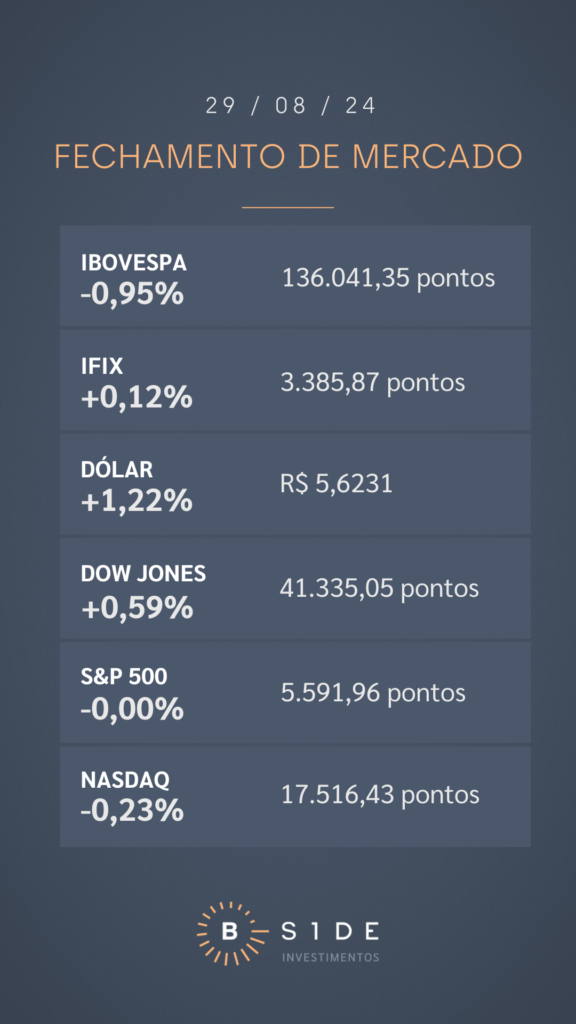 Em Wall Street, as bolsas americanas não definiram sinal único, com o mercado avaliando o PIB do segundo trimestre dos Estados Unidos que registrou crescimento de 3%, de acordo com a segunda leitura do indicador, acima dos 2,8% registrados na primeira leitura e da expectativa de economistas. Após reportar ontem à noite o balanço do 2T24, as ações de Nvidia tombaram 6,38%.