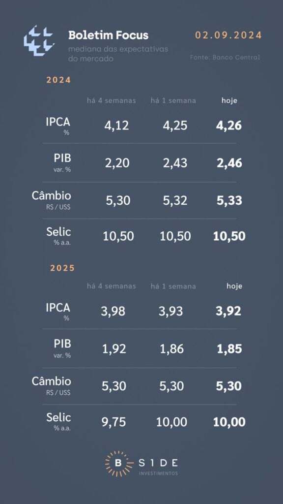No cenário doméstico, a sessão também tende a ter um volume reduzido de negócios por conta do feriado nos EUA. Além disso, a forte queda do minério de ferro pode pressionar os ativos locais. O Boletim Focus, relatório semanal do Banco Central que reúne projeções de economias para os principais indicadores, trouxe revisões altistas para o IPCA e PIB de 2024, mas correções baixistas para os mesmos índices em 2025. O mercado ainda fica atento ao detalhamento do Projeto de Lei Orçamentário Anual (PLOA) hoje, além de mais um leilão de swap no Banco Central, ofertando US$ 735 milhões. Outro ponto de atenção fica por conta do julgamento da Primeira Turma do STF sobre a decisão do ministro Alexandre de Moraes de suspender a rede social X do País.