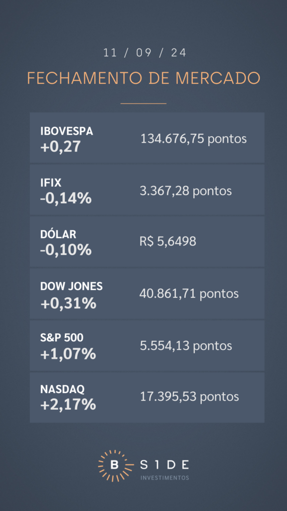 Em Wall Street, as bolsas americanas subiram em bloco, com alta superior a 2% para o índice Nasdaq, impulsionado por nomes de tecnologia, especialmente após notícia de que os Estados Unidos podem facilitar a compra de chips americanos pela Arábia Saudita. O movimento dos mercados acionários aconteceu em linha com a queda dos juros dos Treasuries, os títulos públicos americanos, após o núcleo do índice de preços ao consumidor (CPI) de agosto registrar avanço de 0,3%, acima dos 0,2% projetados, o que freou as apostas por um corte de 50 pontos-base da taxa de juros americana na próxima semana, consolidando a leitura de um afrouxamento monetário de 25 pontos-base promovido pelo Federal Reserve.