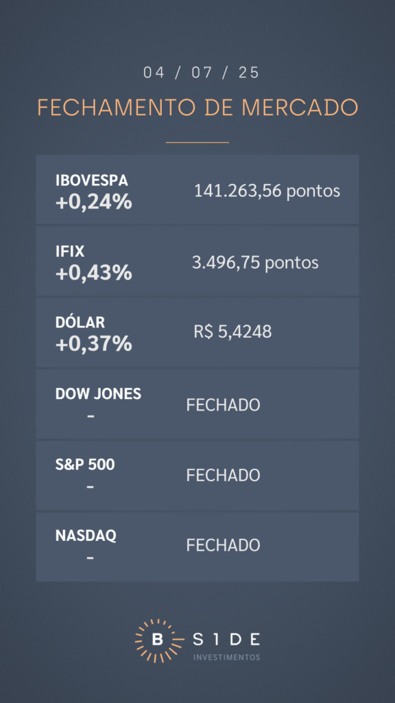 Em uma sessão marcada por liquidez reduzida global por conta do feriado do Dia da Independência nos Estados Unidos, que deixou Wall Street fechada nesta sexta-feira, o Ibovespa registrou alta de de 0,24%, aos 141.263,56 pontos, em novo recorde histórico de fechamento e com encerramento inédito acima dos 141 mil pontos. Por aqui, o mercado repercutiu a notícia de que o ministro Alexandre de Moraes, do STF, suspendeu os decretos do Executivo e do Legislativo a respeito do IOF, além de convocar uma audiência de conciliação para o dia de 15 de julho, com representantes da Presidência, do Senado, da Câmara e da Procuradoria-Geral da República. A decisão foi considerada como uma vitória para o Congresso.