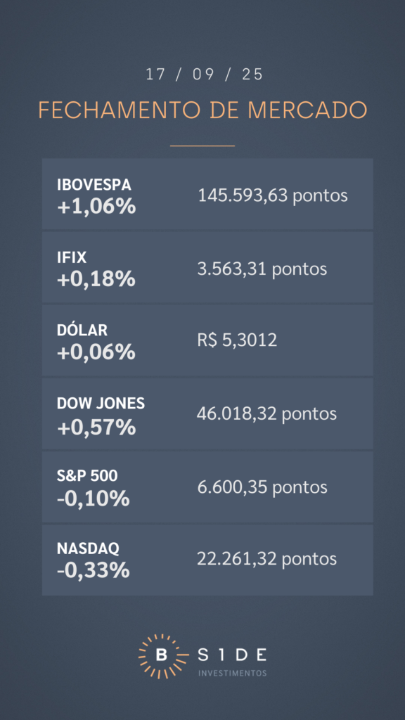 Em alta pelo terceiro dia consecutivo, o Ibovespa registrou valorização de 1,06% nesta quarta-feira, aos 145.593,63 pontos, renovando recorde histórico de fechamento. Na máxima do pregão, o principal índice da B3 alcançou o nível dos 146.260,85 pontos. A Bolsa brasileira foi impulsionada pelas ações de Petrobras PN (+0,60%), Vale ON (+0,17%) e por nomes do setor bancário, com exceção de Banco do Brasil ON (-0,32%), com valorizações de Bradesco PN (+3,47%), BTG units (+1,43%) e Itaú PN (+1,42%). Por aqui, o mercado aguarda a decisão de política monetária do Copom, que será divulgada após o encerramento das negociações, com ampla expectativa pela manutenção da taxa Selic em 15% ao ano. Mais do que a decisão em si, agentes aguardam a comunicação do Banco Central em busca de sinalizações sobre as próximas reuniões do Copom.