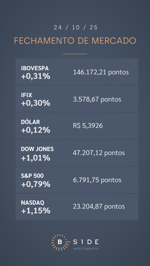 O Ibovespa subiu 0,31%, a 146.172 pontos, acumulando +1,93% na semana, mas desacelerou à tarde com Petrobras pressionada pela queda do petróleo e cautela antes do encontro entre Lula e Donald Trump no domingo. O alívio vindo de CPI e IPCA-15 abaixo do esperado sustentou apostas de cortes de juros aqui e nos EUA, mantendo os DIs em queda firme. No câmbio, após recuar de manhã, o dólar à vista virou e fechou em +0,12% (R$ 5,3926), ainda com baixa de 0,24% na semana, enquanto crescem as discussões sobre início do ciclo de flexibilização da Selic em janeiro.