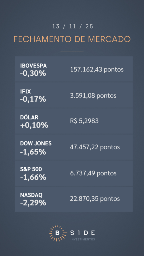 Em linha com o mau humor externo no exterior, o Ibovespa registrou queda de 0,30% na sessão desta quinta-feira, aos 157.162,43 pontos. Este foi o segundo pregão da Bolsa brasileira no campo negativo após 15 dias consecutivos de alta. O principal índice da B3 foi pressionado, principalmente, pela queda de 1,32% de Banco do Brasil ON, após o banco registrar lucro líquido ajustado de R$ 3,785 bilhões no terceiro trimestre de 2025, uma queda de 60,2% em relação ao mesmo período do ano anterior, mais uma vez refletindo a alta da inadimplência no setor agro e o aumento das provisões. O ROE de BB caiu para 8,4%, menor nível desde 2016. A maior baixa do veio veio do tombo de 42,21% de Hapvida ON, com um balanço considerado muito aquém do esperado pelo mercado.