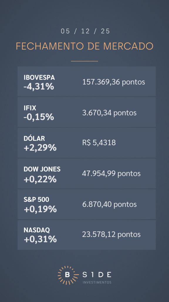 O dia caminhava para o Ibovespa bater recorde de fechamento pelo quarto pregão consecutivo, contudo o noticiario de Brasília mudou os rumos dos ativos locais nesta sexta-feira. Após a notícia de que o ex-presidente Jair Bolsonaro teria escolhido o filho Flávio Bolsonaro para angariar seu capital político na disputa à Presidência da República em 2026, o mercado interrompeu o otimismo e passou a se desfazer de posições. Assim, Bolsa brasileira derreteu 4,31%, aos 157.369,36 pontos, sendo pressionada por seus principais nomes, com quedas de Petrobras PN (-3,54%) e Vale ON (-2,36%), mas especialmente do setor bancário, com forte recuo de BTG Pactual units (-7,91%), Banco do Brasil ON (-7,07%), Bradesco PN (-5,97%) e Itaú PN (-4,62%).