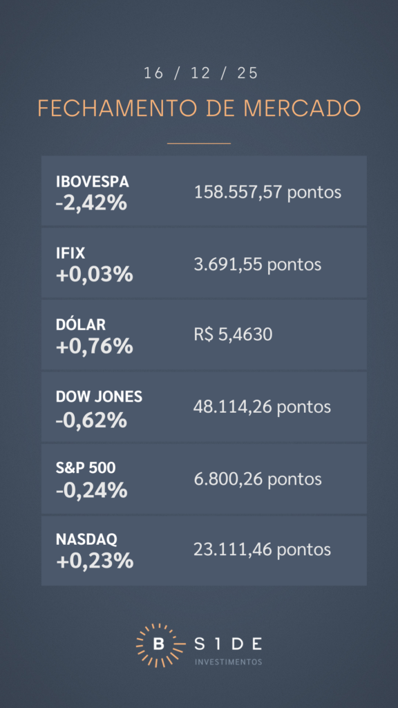 Em Wall Street, as bolsas americanas não definiram sinal único, com os índices Dow Jones e S&P 500 no vermelho e o Nasdaq no azul. Entre os indicadores econômicos, o mercado digeriu dados do mercado de trabalho americano, com o relatório de empregos de novembro superando expectativas ao registrar um aumento de 64 mil vagas no mês, ante projeção de 45 mil empregos no período. Apesar de criação de empregos, o desemprego e os salários de novembro terem vindo acima do esperado, as revisões negativas de agosto e setembro e as vendas no varejo abaixo das projeções elevaram as apostas por um corte de juros pelo Fed em 2026.