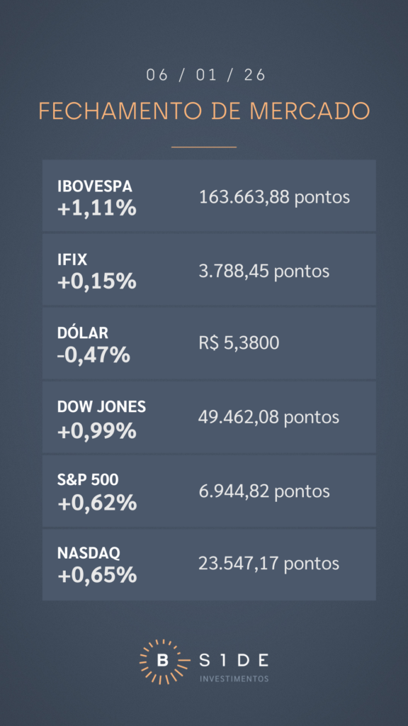 Em Wall Street, as bolsas americanas avançaram em bloco, com o índice Dow Jones encerrando acima dos 49 mil pontos pela primeira vez na história. O índice S&P 500 também renovou o recorde histórico de fechamento. O mercado praticamente ignorou os riscos geopolíticos após o ataque dos Estados Unidos à Venezuela, dada a pouca relevância do país sul-americano no mercado global, e seguiu focado em comprar papéis do setor de tecnologia, com destaque para a alta de 3,37% de Amazon. Outros nomes ligados ao segmento de inteligência artificial voltaram a mostrar importantes avanços, casos de Micron Technology (+10,00%) e Palantir (+3,23%).