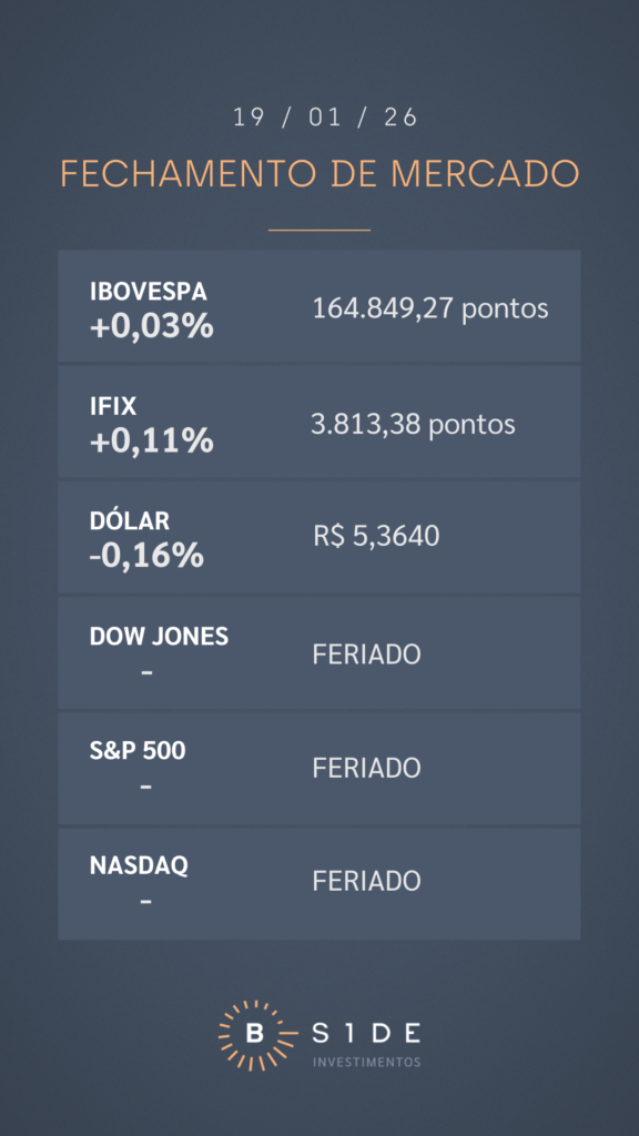 No mercado de câmbio, o dólar à vista fechou em leve queda de 0,16%, cotado a R$ 5,3640, também impactado por um baixo volume de negócios já que os mercados americanos ficaram fechados devido ao feriado de Martin Luther King. Mesmo diante de uma aversão global a risco por causa do cenário geopolítico, a moeda americana perdeu terreno na comparação com a divisa brasileira. Além dos conflitos com o Irã, o presidente dos EUA, Donald Trump, anunciou tarifas sobre produtos de oito países europeus a fim de pressionar por um acordo sobre a compra da Groenlândia, com alíquotas de 10% a partir de fevereiro e de 25% em junho, caso não haja avanço nas negociações.