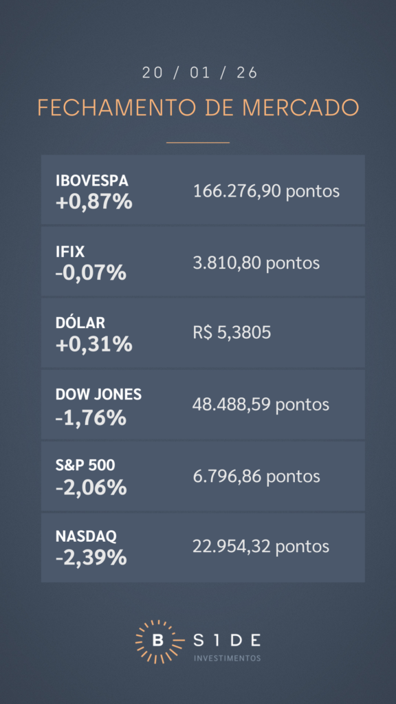 Em Wall Street, no retorno de feriado, as bolsas americanas recuaram com força, com o mercado apreensivo após o presidente dos Estados Unidos, Donald Trump, declarar que “não há volta” em seu objetivo de controlar a Groenlândia. Inclusive, o primeiro-ministro da Groenlândia, Jens-Frederik Nielsen, pediu à população da ilha que comece a se preparar para uma invasão militar ao território. Diante deste cenário, os rendimentos dos títulos do Tesouro americano dispararam. O ouro disparou mais de 3%, superando os US$ 4,7 mil a onça-troy, patamar inédito.