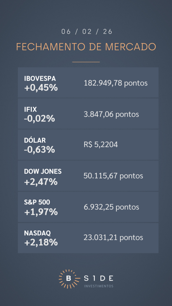 Em Wall Street, as bolsas americanas avançaram em bloco, com o índice Dow Jones encerrando acima dos 50 mil pontos pela primeira vez na história. O pregão foi marcado por uma recuperação das ações de tecnologia e do bitcoin. Nvidia e Broadcom foram as duas vencedoras do dia, com valorizações de 7,87% e 7,22%, respectivamente. Mesmo com a alta desta sexta-feira, os índices S&P 500 e Nasdaq encerraram a semana com desempenho negativo. Por outro lado, o Dow Jones teve resultado semanal positivo, se beneficiando de uma rotação para ações de setores econômicos cíclicos.