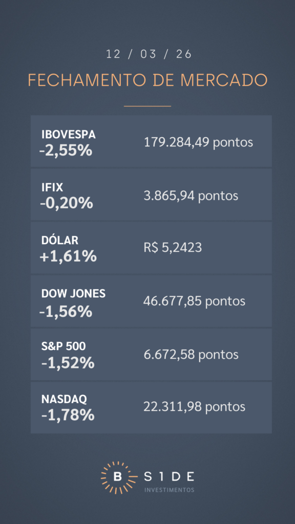Em Wall Street, as bolsas americanas recuaram em bloco, com o mercado repercutindo a alta dos preços do petróleo, diante de preocupações com com interrupções no fornecimento da commodity, enquanto a guerra dos EUA com o Irã não dá sinais de um encerramento próximo. O petróleo disparou 9%, com o barril do tipo Brent ultrapassando o nível de US$ 100. O novo líder supremo do Irã, Mojtaba Khamenei, nomeado em 9 de março, afirmou que o Estreito de Ormuz deve permanecer fechado como “ferramenta para pressionar o inimigo”. Além disso, ontem à noite mais três embarcações estrangeiras foram atingidas no Golfo Pérsico, depois que três navios foram atingidos na quarta-feira.