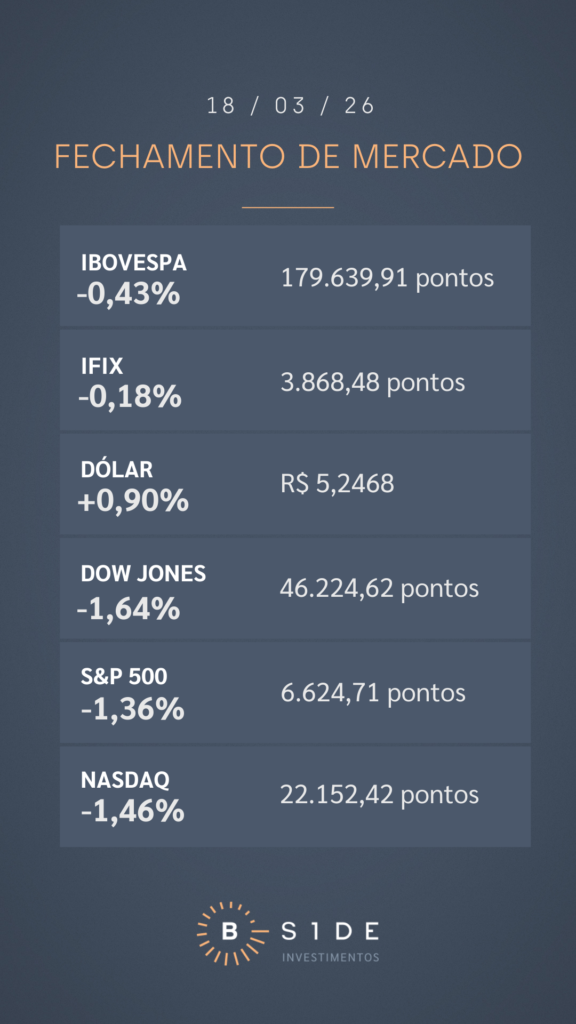 Em sessão marcada por decisões de juros no Brasil e nos Estados Unidos, o Ibovespa até iniciou o dia no campo positivo, contudo mudou de sinal pressionado pelos mercados acionários de Nova York e registrou recuo de 0,43% nesta quarta-feira, aos 179.639,91 pontos. As ações de Petrobras ON e PN subiram 1,77% e 1,34%, respectivamente, com o petróleo do tipo Brent acelerando mais de 4%, após o Irã reafirmar que escalará a guerra. Na maior alta do dia, os papéis de Eneva ON dispararam 15,08%, com investidores de olho no leilão de reserva de capacidade (LRCap), com potencial de os lances dados pela companhia possam destravar novos projetos e renovar contratos de geração. Pelo lado negativo, as ações de Vale ON recuaram 2,32%.