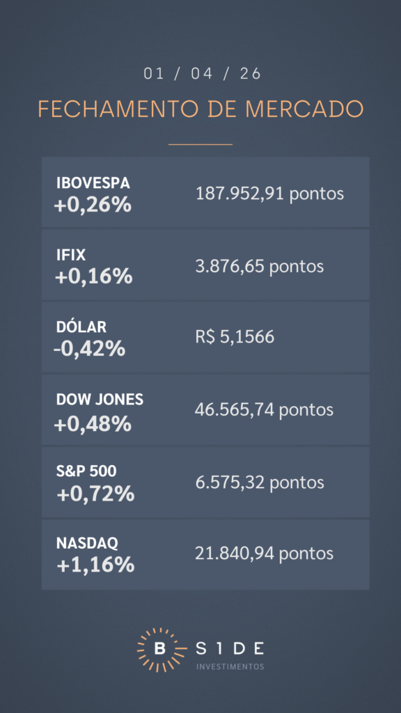 Em uma nova rodada de otimismo global com a perspectiva de fim da guerra entre Estados Unidos e Irã, o Ibovespa surfou na onda do sentimento positivo para os ativos locais e registrou avanço de 0,26%, aos 187.952,91 pontos. Apesar da alta de Vale ON (+0,63%) e do setor bancário, com valorização de BTG Pactual units (+2,33%), Banco do Brasil ON (+2,74%), Bradesco PN (+1,36%) e Itaú PN (+0,84%), a Bolsa brasileira não teve desempenho superior por conta do recuo de 2,67% dos papéis de Petrobras PN, que acompanharam o movimento de baixa do petróleo no mercado internacional. O barril do tipo WTI caiu 1,24%, a US$ 100,12, enquanto o Brent cedeu 2,70%, cotado a US$ 101,16.