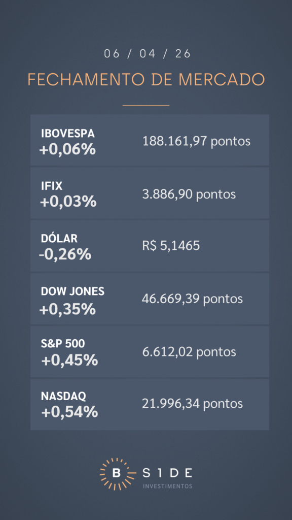 Em Wall Street, as bolsas americanas registraram leve alta, com o índice S&P 500 registrando o quarto dia consecutiva no azul, diante de um desempenho do preço do petróleo, que fechou em altas inferiores a 1% nesta segunda-feira, tanto o Brent quanto o WTI, porém ainda em patamares próximos a US$ 110 o barril. O mercado segue na expectativa por um fim próximo da guerra entre EUA e Irã, mesmo que os dois países ainda adotem posturas cautelosas. O presidente americano Donald Trump manteve discurso duro ao afirmar que os EUA destruirão usinas de energia e pontes iranianos caso o governo de Teerã não reabra o Estreito de Ormuz até às 20h (horário de Brasília) de terça-feira.