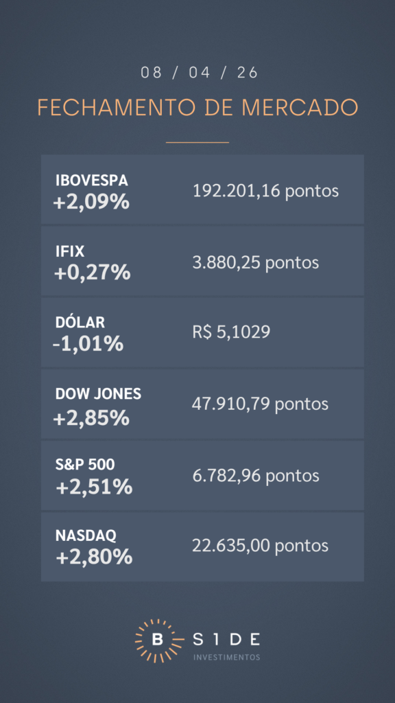 Um sentimento de alívio tomou conta dos mercados nesta quarta-feira, após acordo de cessar-fogo entre Estados Unidos e Irã por duas semanas. A Bolsa brasileira registrou alta de 2,09%, aos 192.201,16 pontos, impulsionada, principalmente, pelo setor bancário, com avanços de BTG Pactual units (+6,72%), Bradesco PN (+5,00%), Banco do Brasil ON (+4,48%) e Itaú PN (+3,50%). As ações de Vale ON subiram 2,27%, ignorando a queda de 1,35% do minério de ferro no porto chinês de Dalian. Pelo lado negativo, pressionados pela forte baixa do petróleo, os papéis de Petrobras PN tombaram 3,92%.